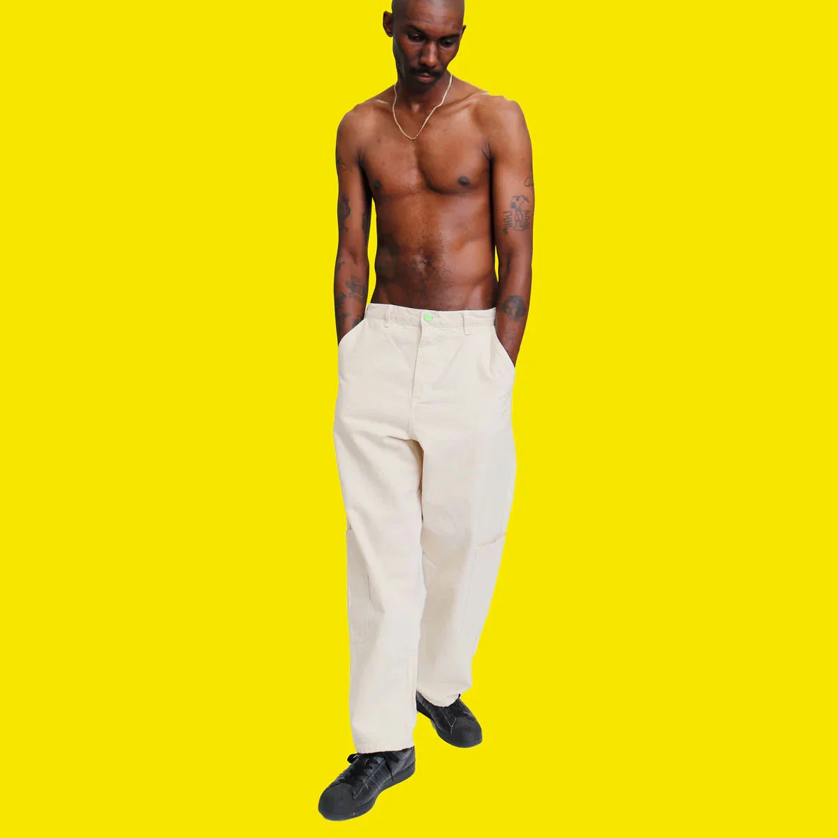 These soft-washed 100% cotton canvas pants have a fixed waist front, elastic waist back, and zipper fly. Big side patch pockets + back patch pocket. Lightly cropped and machine washable.
